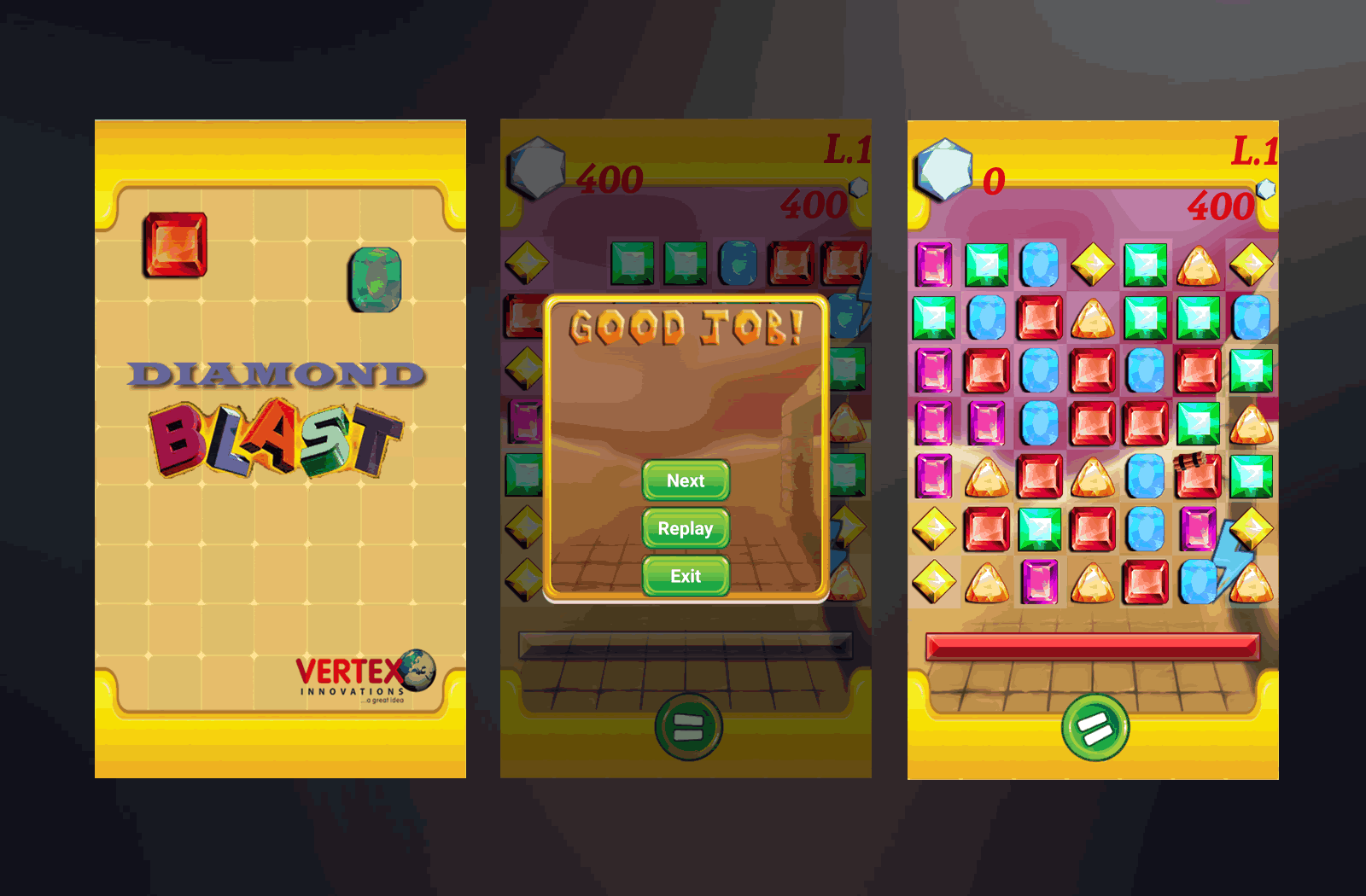Diamond Blast is a variation of a match three puzzle game. The board size measures in a 9x9 filled with several different colors diamonds and jewels.